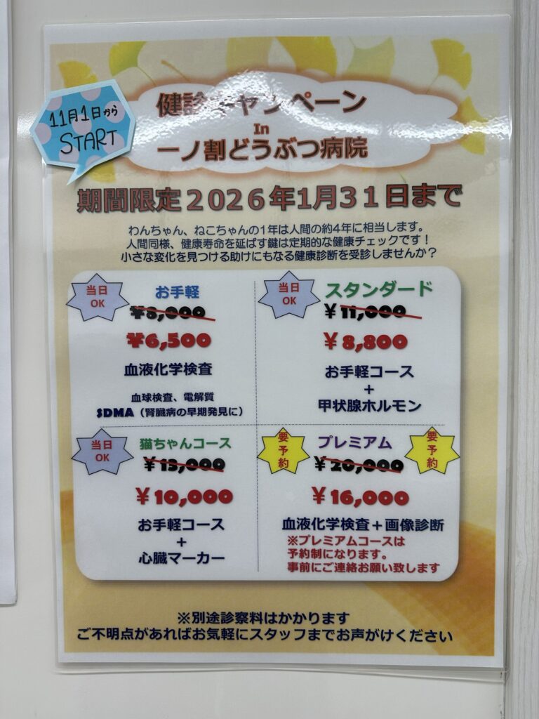 2026年1月31日まで普段よりお得に健康診断を行えるキャンペーンを実施しております。この機会に一度健康診断してみませんか?外からはわからない異常を早めに発見し、元気に過ごせる時間を延ばしてあげましょう。